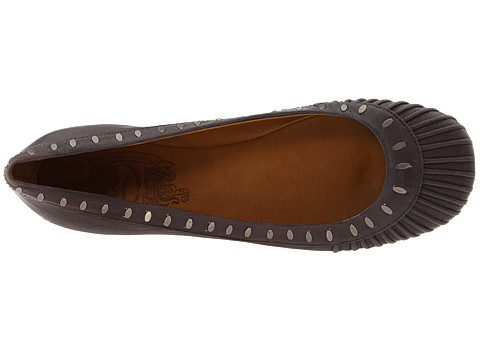 Obermaterial aus Leder mit nailhead Ornamentik um Kragen und Rüschen Detail um Zehe.